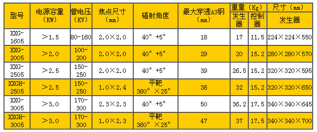 XXG—1605型、XXG—2005型、XXG—2505型、XXG—3005型探傷機(jī)均為波紋陶瓷管定向輻射探傷機(jī)XXGH—2505型、XXGH—3005型為波紋陶瓷管周向輻射探傷機(jī),其最大的特點(diǎn)是X射線管采用電壓高、體積小、性能穩(wěn)定、壽命長(zhǎng)的波紋陶瓷管,從而使X射線發(fā)生器的體積更小,重量更輕,在使用壽命和抗震方面優(yōu)于其它種類的X射線探傷機(jī)。